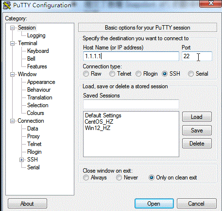 在 Saved Session 中输入希望保存的名字,然后单击 Save 按钮,这样以后可以方便地调用而不需要每次输入 IP 地址。